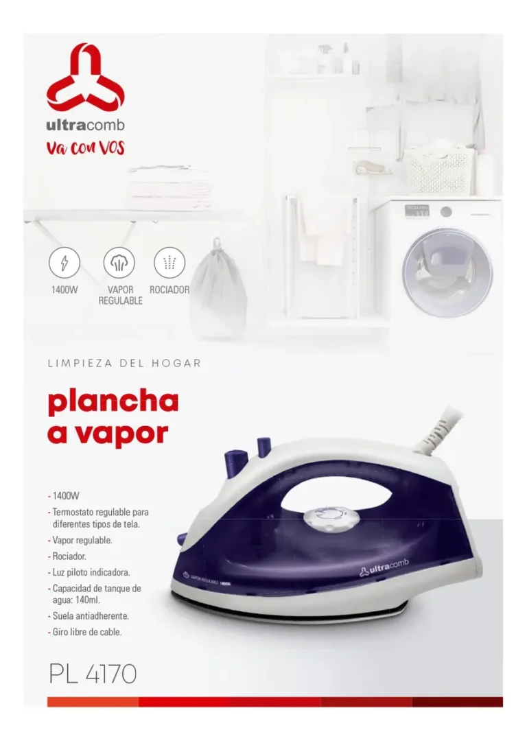 La plancha a vapor Ultracomb PL-4170 está diseñada para ofrecer un planchado práctico y eficiente, adaptándose a distintos tipos de telas mediante un control sencillo y funcional. Cuenta con una potencia de 1400W y termostato regulable que permite ajustar la temperatura según el tipo de prenda, ayudando a evitar daños en los tejidos. Incorpora vapor regulable y función rociador que facilita la eliminación de arrugas