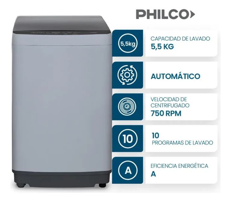 Este modelo de carga superior en elegante gris combina diseño y eficiencia para simplificar tu rutina de lavado. Con su capacidad de 5.5 kg y 10 programas de lavado, podés elegir el ciclo perfecto para cada prenda. Su velocidad de centrifugado de 750 RPM